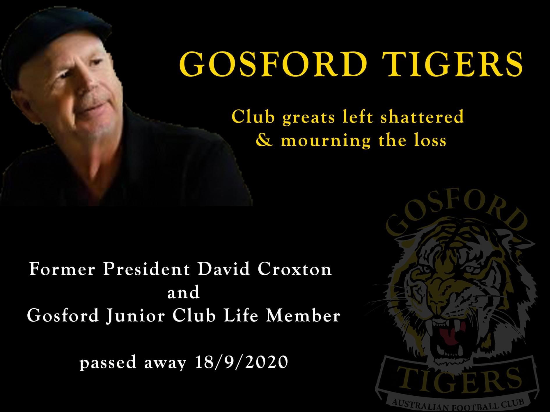 The Gosford Tigers AFL Club are in mourning after learning the news of the shock loss of one of its greats, Former Junior President David Croxton, who passed away 18 September.